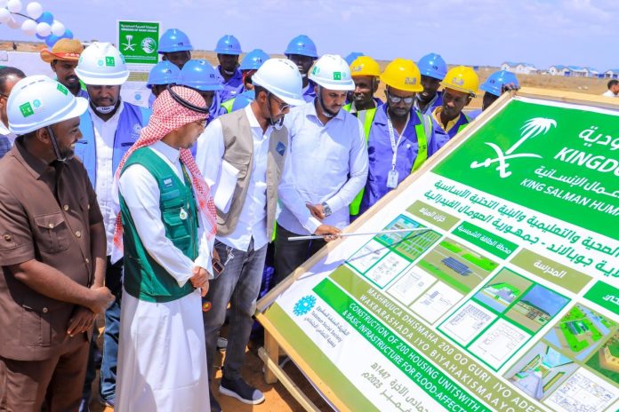 The Minister of Relief and Disaster Management of Jubbaland, Abdirahman Mohamed Dhiriq, together with Dr. Yasid Abdalla Hamud, Head of the King Salman Humanitarian Aid and Relief Center for Africa, today laid the foundation stone for a major housing project in Luglow/Halgan, on the outskirts of Kismayo.